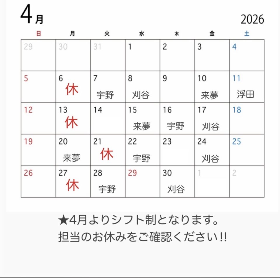 シフト制となっておりますので、担当のお休みをご確認ください!
