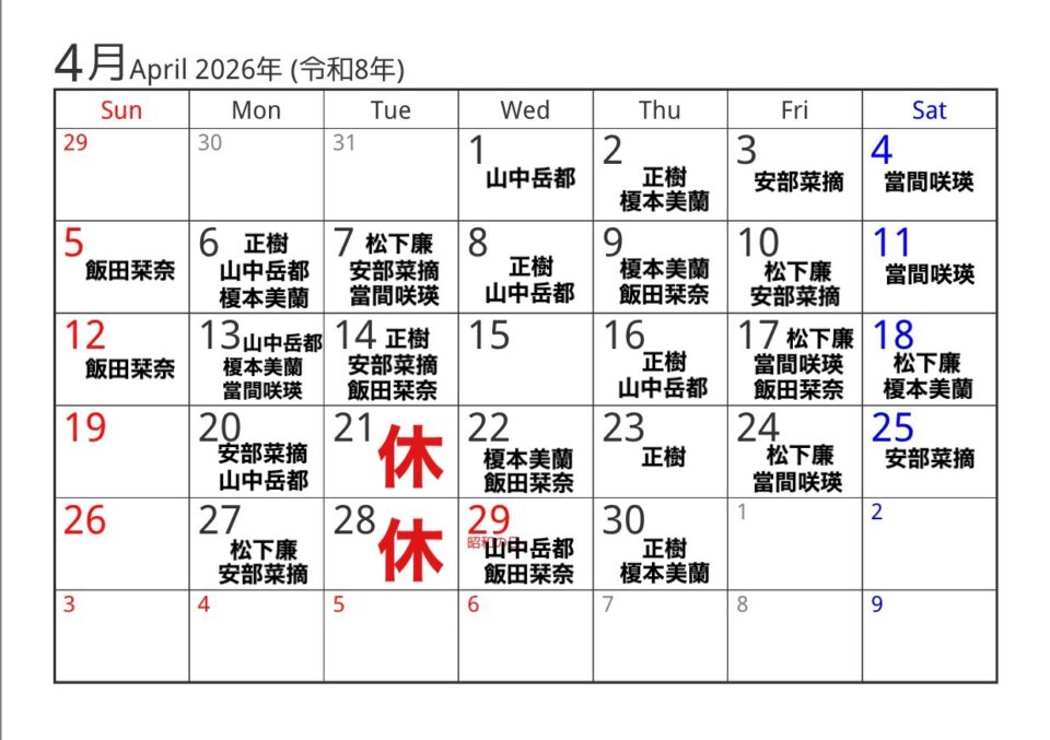 スタイリスト毎のお休みは